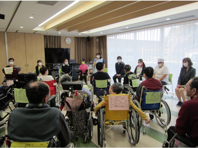 たくさんの利用者様が集まる中で、久しぶりに「はなのきの里」に戻ってきた職員や昨日お別れしたはずの職員?、新しく採用された職員など、皆で笑顔で迎えることができました。