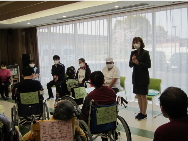 新しい職員に興味津々の利用者様。職員も、「早く皆さまの顔と名前を覚えて、仕事を頑張りたいです。」と決意を表明していました。