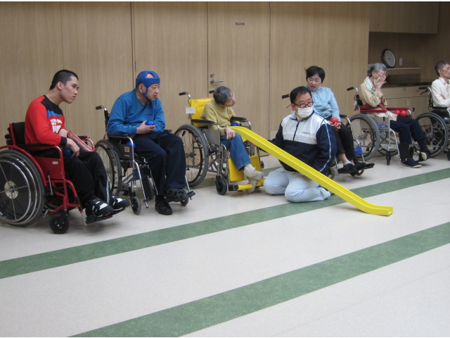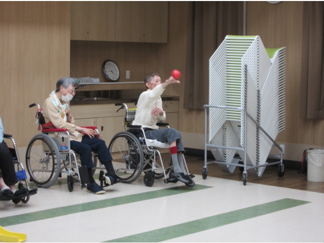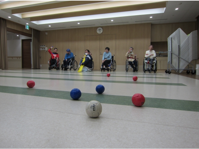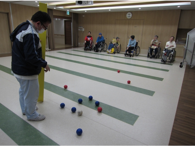 はなのきの里のスポーツ活動で人気の種目“ボッチャ”。 赤チームと青チームに分かれ、自分たちのチームボールがジャックボール(白)にいかにして近づけるか策を練りながら(!?)、思い思いにボールを投げていました。 投げたボールがジャックボールに近づくと歓声が沸き、大いに盛り上がりました~!