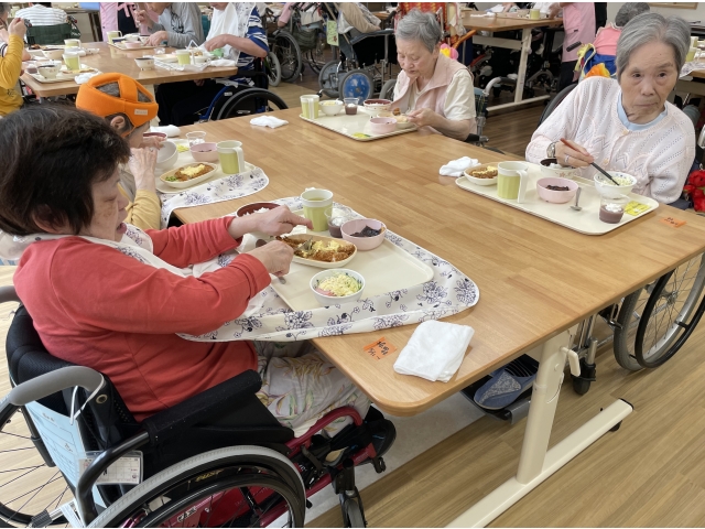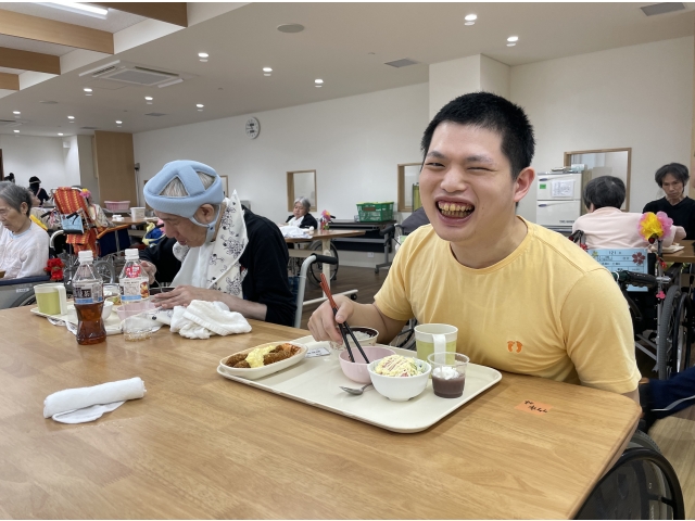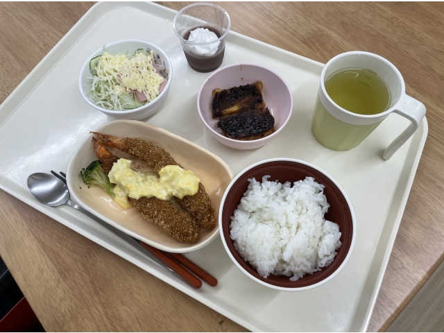 6月16日の昼食は、はなのきの里にいながら愛知名物が味わえる ご当地グルメの日でした~Σ(・ω・ノ)ノ! 白米は、ご当地ブランドの「あいちのかおり」。大きな手作りエビフライが2本。 赤味噌の田楽豆腐に、全国2位の生産量を誇るキャベツのサラダ。 デザートは、手作り水ようかんシロノワール風♪ 利用者の皆さん、大満足の笑顔でした♪
