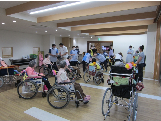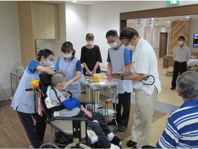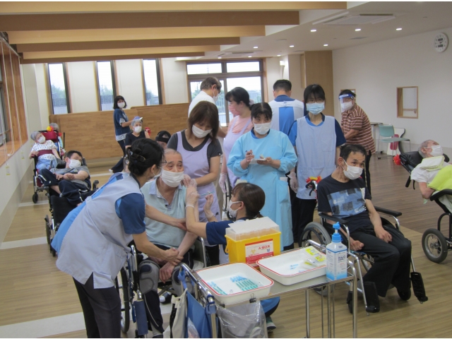 利用者さんは車椅子のままで、大河内先生と看護師が移動して接種を行う方法で、とてもスムーズに行うことができました。尚、2回目の接種は7月初旬の予定となります。