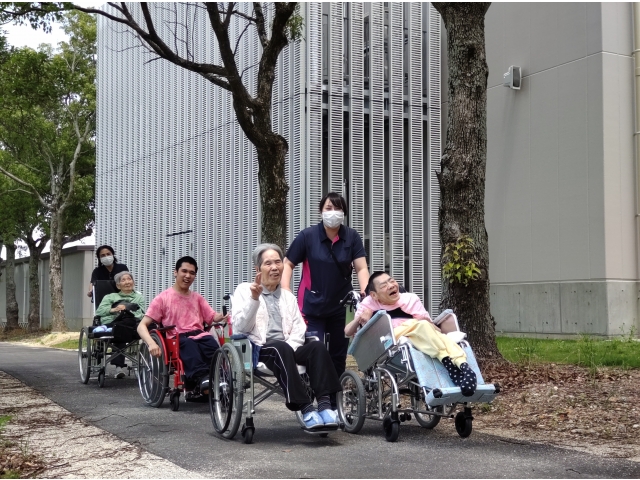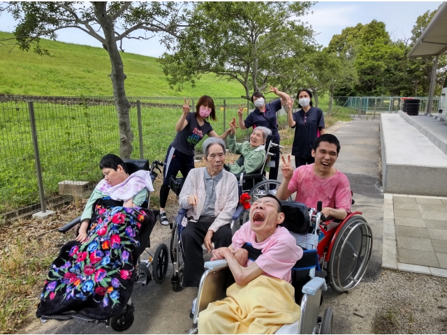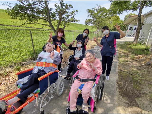 ある晴天の日。少し汗ばむような陽気ではありましたが、施設敷地内をお散歩する一行を発見!! ほのぼのとした光景に、カメラを取りに事務所まで猛ダッシュ!! 素敵な笑顔み~つけた!!( *´艸`)