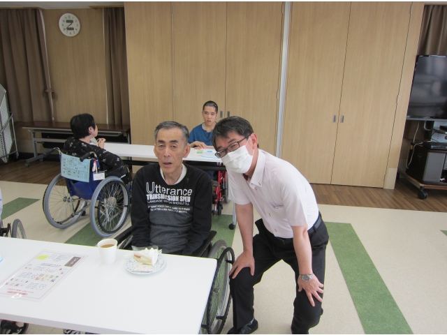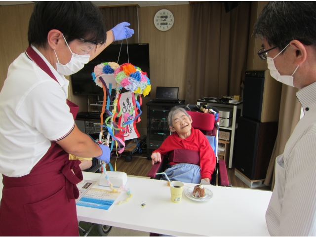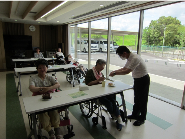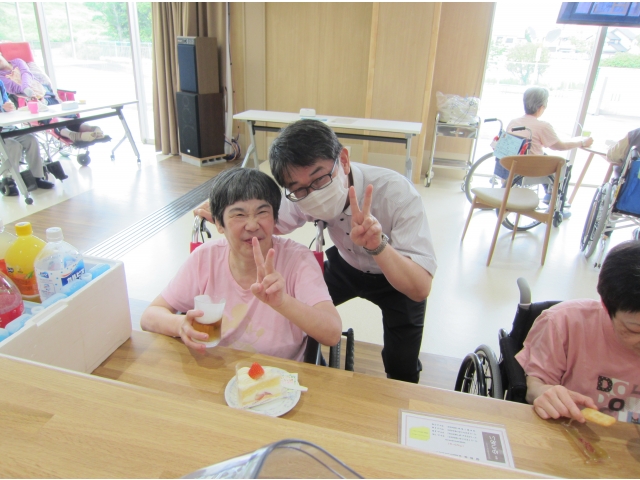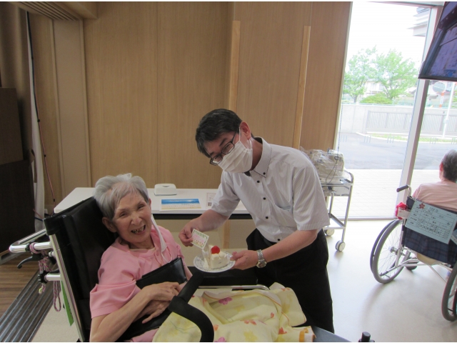 お誕生月の利用者さんの特別なお楽しみ、喫茶の時間帯を利用して月に1回設定されている『バースデイプレゼントDAY』 おしゃれなバースデイソングをBGMに、誕生月の利用者さんをお祝いしました!! お祝いアイテムのくす玉も大活躍!! お好みのケーキを頬張り、笑顔がいっぱい溢れていました~\(^o^)/