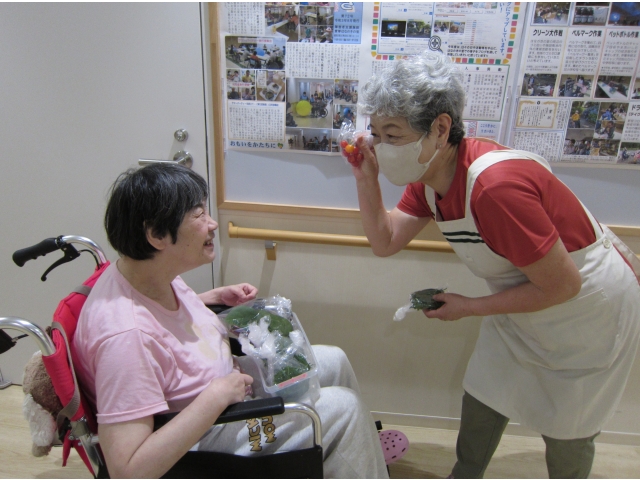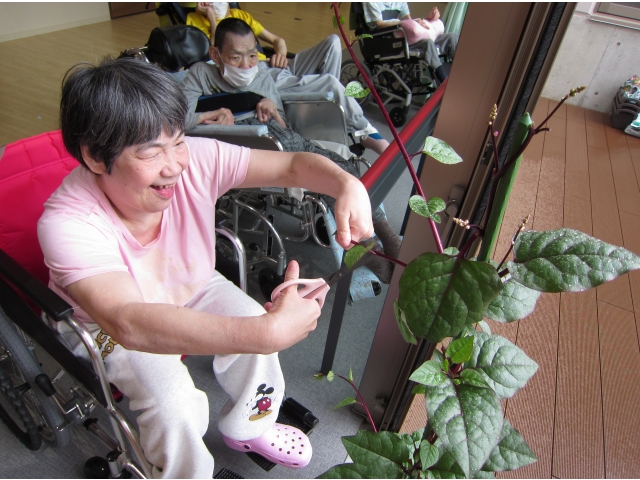 青じそを収穫して、ハーブの香りを堪能…。利用者のみなさんは「いい香りだね~」、「青じその天ぷらおいしいよね~」など青じそを手に会話が弾みました!!