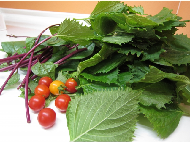 はなのき家庭菜園…。中庭でアサガオを育てる傍らミニトマト・ツルムラサキ・青じそ・赤じそを育てました。