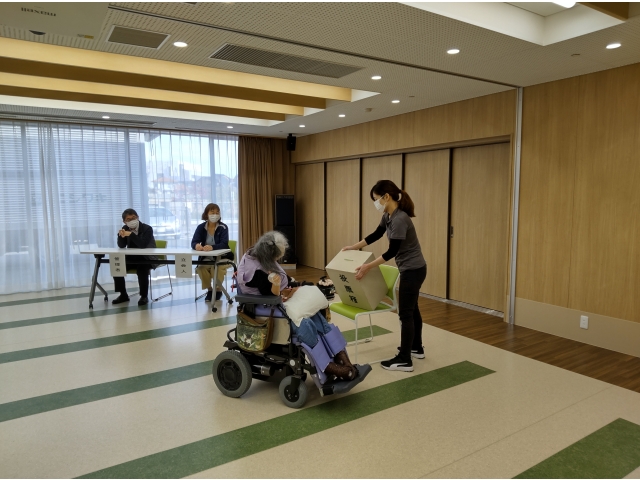 令和3年10月27日に第49回衆議院議員総選挙(10月31日執行)・最高裁判所裁判官国民審査の不在者投票をはなのきの里の集会室で執り行いました。 国政へ意思を伝える貴重な機会…。厳粛な雰囲気の中、利用者のみなさんは、真剣に考え、自身の意思を票に託していました。
