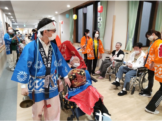 お祭り衣装に身を包んだ所長と実行委員の利用者。本物の獅子舞で各フロア内を練り歩きました~!!