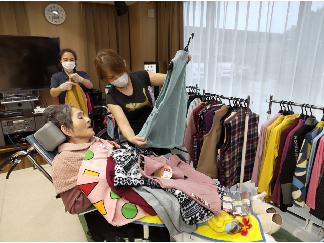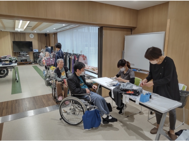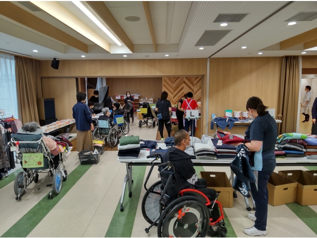 もうすぐ12月…、次第に寒さが厳しくなってくる前に冬支度… 利用者の楽しみの一つでもある衣類売店が開催されました。今回は冬物衣料中心に商品がズラリと並びました。 ハンガーラックや机に並べられた上着やズボンを手に取って品定め… 職員と一緒に相談しながら購入する方、商品を前にどれにしようか悩んでいる方、様々な人間模様がみられましたが、みなさんお買い物を楽しんでいました。