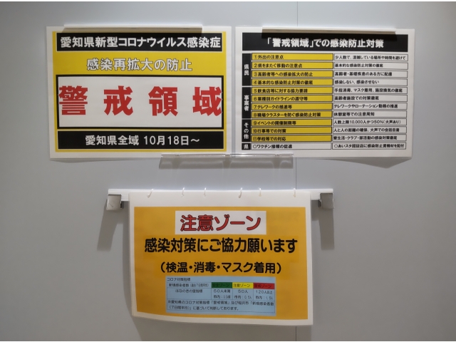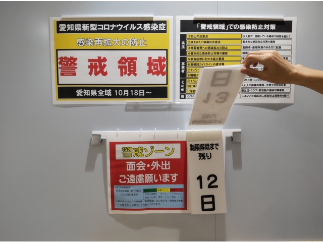 愛知県のコロナ対策指標「警戒領域」及び稲沢市 「新規感染者数(7日平均)」に基づき、はなのきの里独自の指標に照らし合わせて3段階に分けて、感染リスクの度合いを「見える化」して感染予防対策を意識づけています。