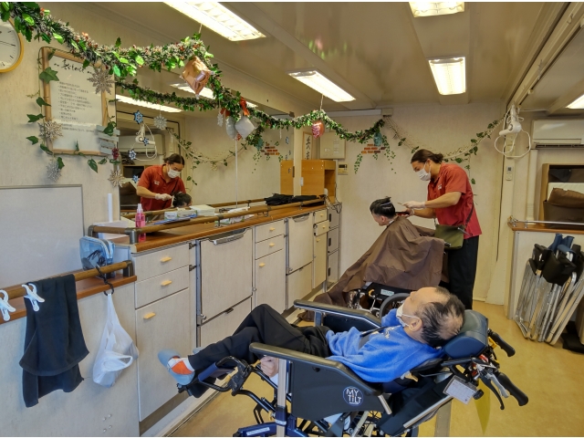はなのきの里では、利用者のご希望もあって月2回程移動美容「そよ風」さんを利用しています。 今回はクリスマスシーズンということもあって、店内がクリスマスモードになっていました~。 スタッフの方が「利用される利用者さんに少しでも喜んでもらえたらいいかなぁと思って…」と。 スタッフさんの心遣いに利用者さんも職員も心がほっこりしました。