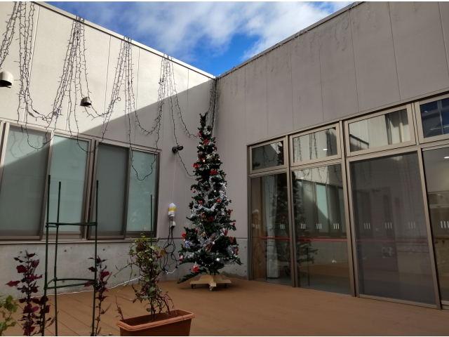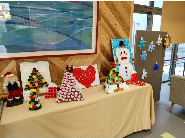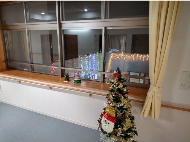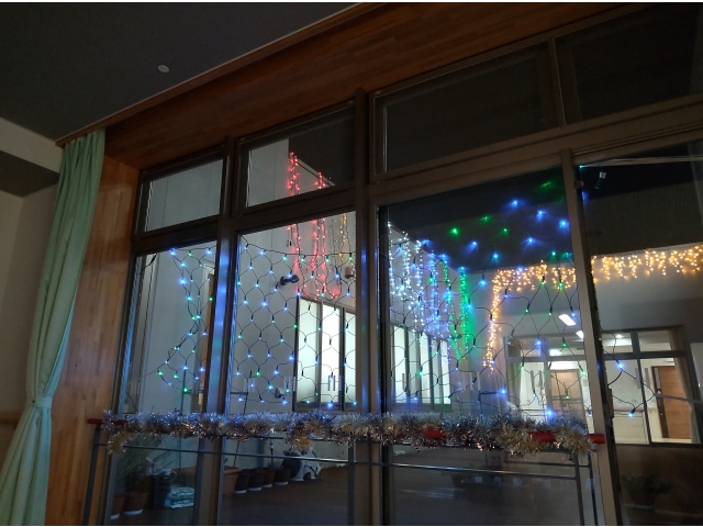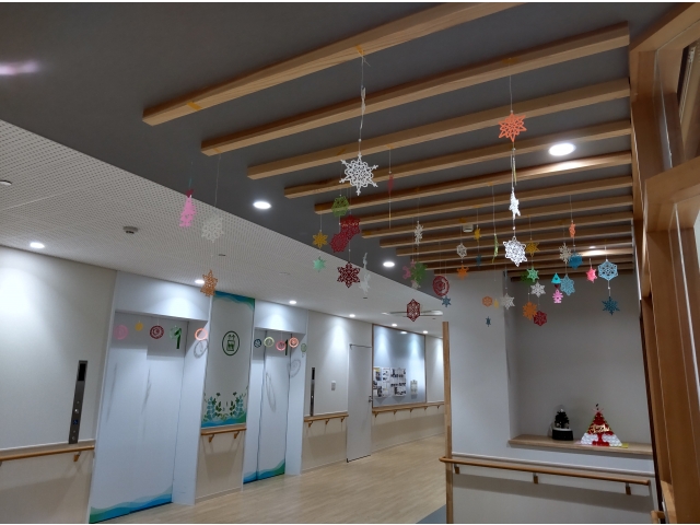 利用者さんと一緒に作ったペットボトルキャップのクリスマス飾り。お部屋や玄関ロビーに飾って、みなさんの目を楽しませています。また、廊下には雪の結晶の飾りも登場! さらに、はなのきの里では冬の風物詩となっているウィンターイルミネーションも中庭で開催!大きなクリスマスツリーもイルミネーションに華を添えています! もうすぐクリスマス…。はなのきの里にもサンタさんは来てくれるかな~( *´艸`)