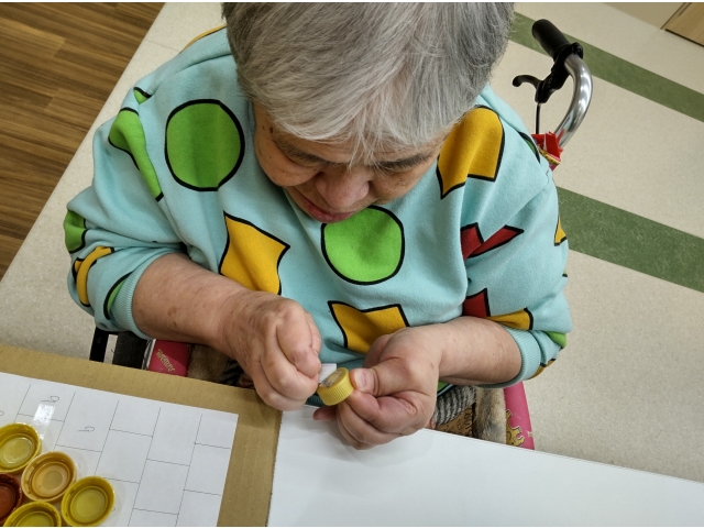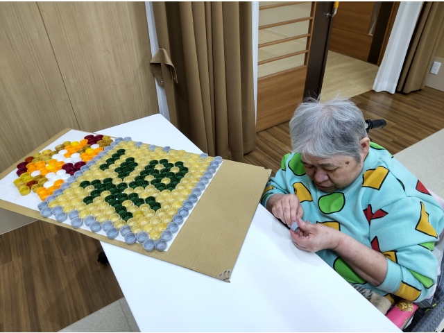 前の作品に別れを告げて、再びキャップを色ごとに仕分けをし、新しい作品の台紙に指定された色を貼り付けるといった流れで、指先等のリハビリも兼ねて楽しく活動を続けています!