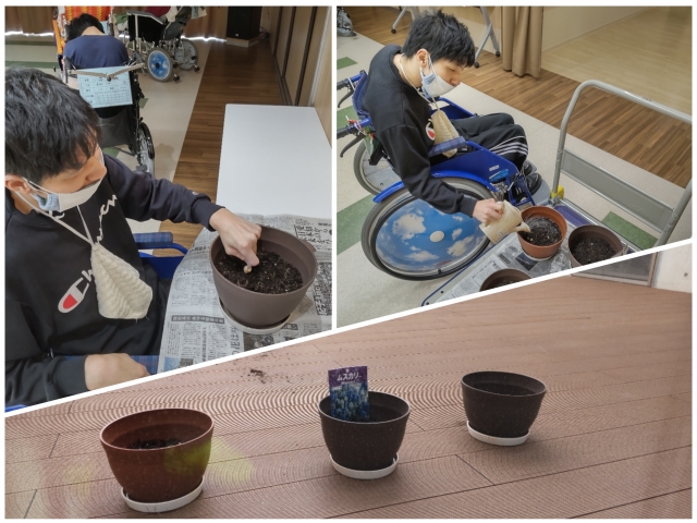 少しずつ春らしい陽気になってきました。 中庭の鉢植えが淋しい状態になっていることを気にかけていた職員さんから、ムスカリの球根を頂きました。 「いきものがかり」の活動で、鉢植えに球根を植え付けてもらいました。 これから少しずつ、他のお花や野菜を育てていきたいと思っています。