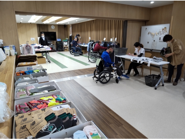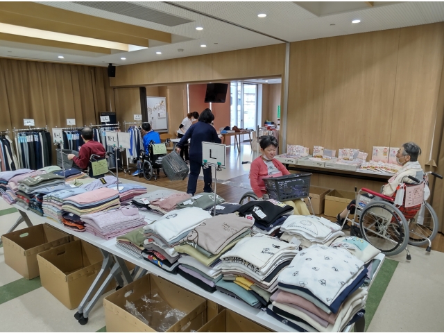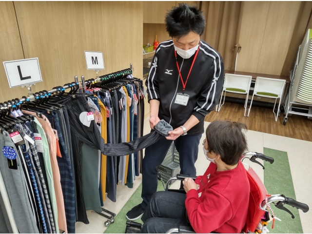三寒四温の季節柄、日に日に寒さも和らぎ春の陽気に包まれる日も増えてきました。 そろそろ冬物衣料から春物衣料への衣替え。 …ということで、春物衣料を中心に衣類売店を実施しました。 この日を楽しみにされていた利用者さん。ズラリと並んだ衣料品を手に取り品定め…。 みなさん、気に入った衣類をカゴに入れて満足な表情をされていました。
