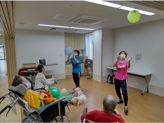 施設内を歩いていると、多目的室で風船バレーを楽しんでいる姿が目に飛び込んできました。 とっても素敵な場面!!急いでカメラを取りに事務所へ…。 みんなでワイワイ風船バレーを楽しんでいる姿を息を切らしながらも写真に収めることが出来ました!! 見ていたこちらも心がほっこりしました!