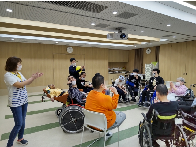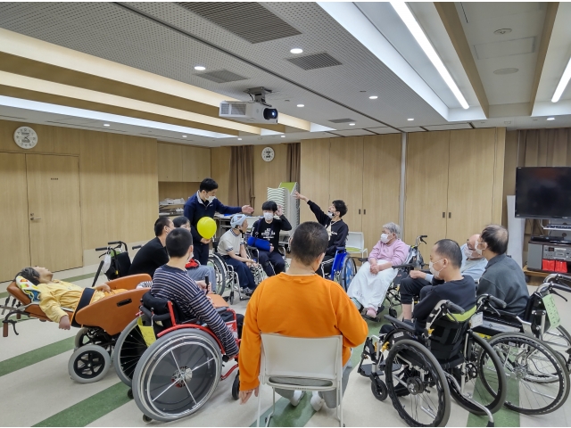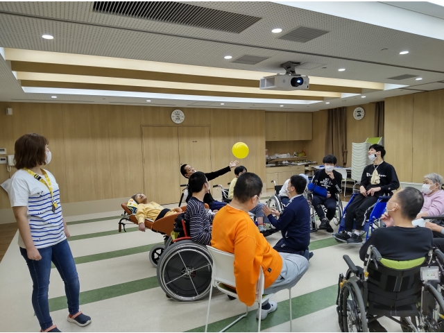 参加者が円陣を組んで風船バレーを楽しみました。ただ、風船バレーをするのではなく、利用者同士が交流を深められるよう、利用者さんの好きなことや苦手なものなどをクイズにして、みんなで言い当てる等して、ラリーの時はハッスル!ハッスル!休憩を兼ねてのクイズでは和やかに…。