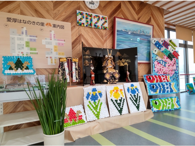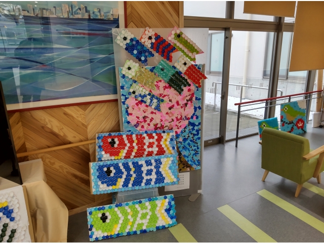 ペットボトルキャップアートで制作した色とりどりの鯉のぼりや兜、あやめが並びました。