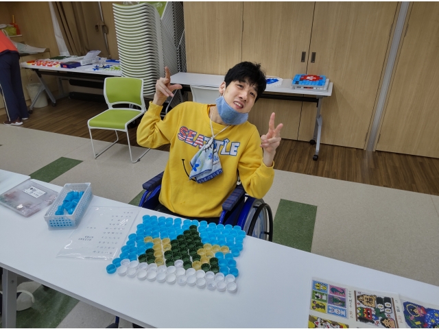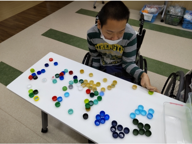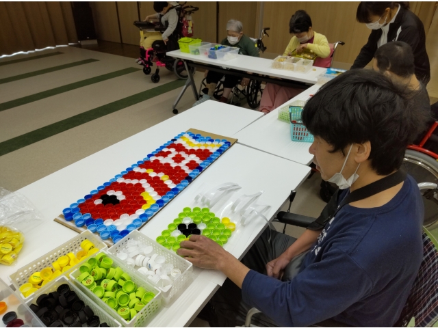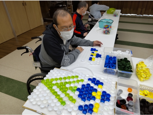 みなさん、キャップアートも手慣れたものでお手本を見ながら上手に作品を手掛けていました。