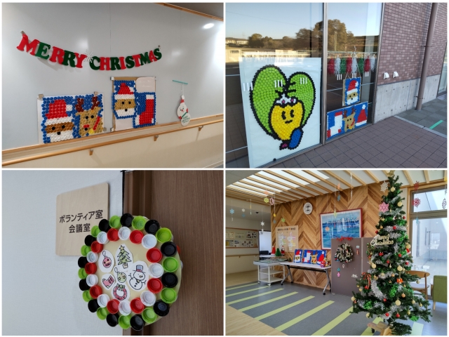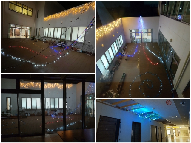 はなのきの里では、クリスマスを盛り上げるべく日中活動でクリスマスリースやサンタさん等をペットボトルキャップで作成して飾っています。 施設の所どころにはクリスマスツリーを設置しています。 そして、恒例となっているイルミネーション!!今年も中庭に設置しました。 はなのきの里のクリスマス装飾いかがでしょうか??