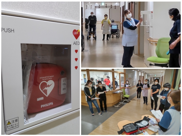 心肺蘇生法とAEDを使った救命の仕方について解説した動画を視聴し、その後、はなのきの里に設置してあるAEDの使用方法についてや夜間の限られた職員で対応する場合には、慌てず役割を予め決めて対応にあたると良い等の助言を受けました。