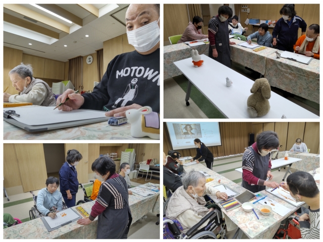 今回の「絵心クラブ」は、講師のボランティアさんが今年の干支の「うさぎ」をテーマに、うさぎのぬいぐるみや置物を持ってきてくれました。 自分の描きたい『うさぎ』を決めて、思い思いに鉛筆や筆を走らせていました。