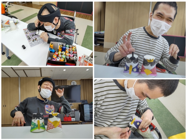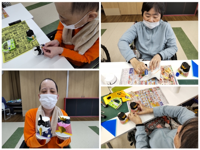 利用者さんに髪の毛を黒く塗ってもらったり、髪飾りや笏などを張り付けたりしてもらいました。