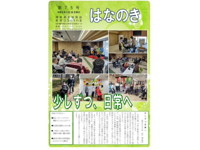 愛厚はなのきの里機関紙「はなのき75号」を発行しました。今号は、「はなのきの里による取り組み」や「季節の行事」などを中心に、幅広く掲載しており、ぜひ多くの方に読んでいただきたい内容となっております。機関紙「はなのき」は、施設や利用者様の様子をご家族や地域、各機関等の皆様に発信し、地域との共生を目指します。「はなのき75号」ははなのきの里『広報・お知らせ』からご覧いただけます。