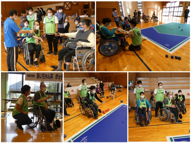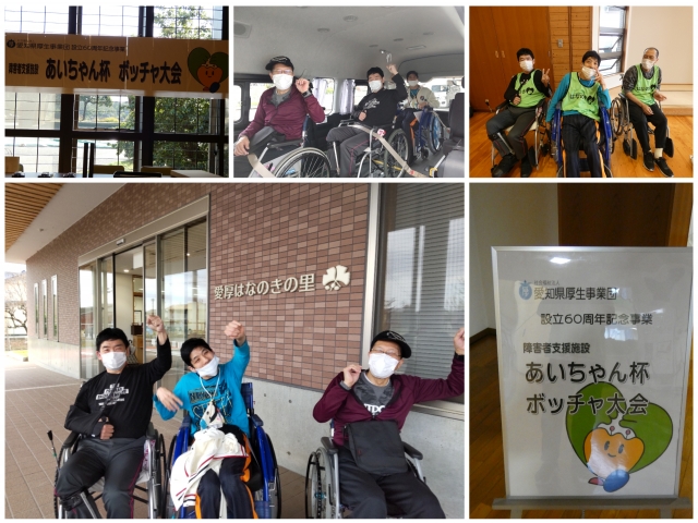 愛知県厚生事業団設立60周年記念事業で障害者支援施設「あいちゃん杯ボッチャ大会」に、はなのきの里を代表して3名の利用者さんと職員が参加しました。