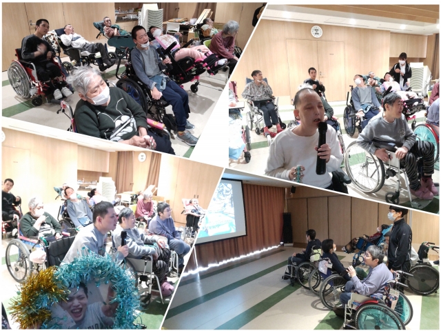 集会室には多くの利用者さんが集まり、各々が希望する曲を歌ったり、楽器や手拍子でその場を盛り上げたりと大盛況。