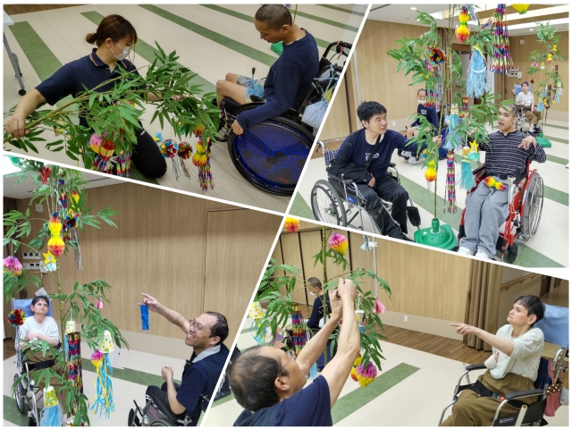 七夕を前に七夕の飾り付けをしました。 毎年、飾付けに使用する竹を旧施設では中庭で、新施設になってからは一宮苑で確保してしましたが、今年度はイミテーションの笹を購入しました。これにより、葉っぱが丸まったり落ちたりせずにすみます。 みんなで協力してキラキラした七夕飾りを飾り付け、各フロアに飾りました。願い事の書かれた短冊は、各居室の笹に結びました。 みなさんの願いが叶いますように…