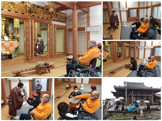 あいにくの雨の中、2名の利用者代表と職員とでお寺に向かいました。