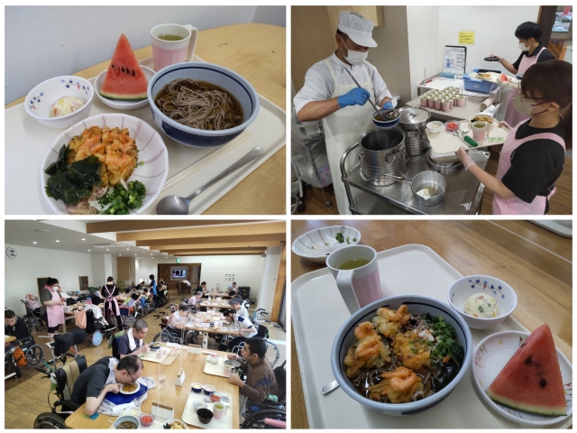 昼食のメニューは実行委員の意見で「冷やしぶっかけそば」、「かき揚げ」「ポテトサラダ」、「スイカ」でした。ご馳走が食卓に並び、午後の部のアトラクションに備えて腹ごしらえをしました。