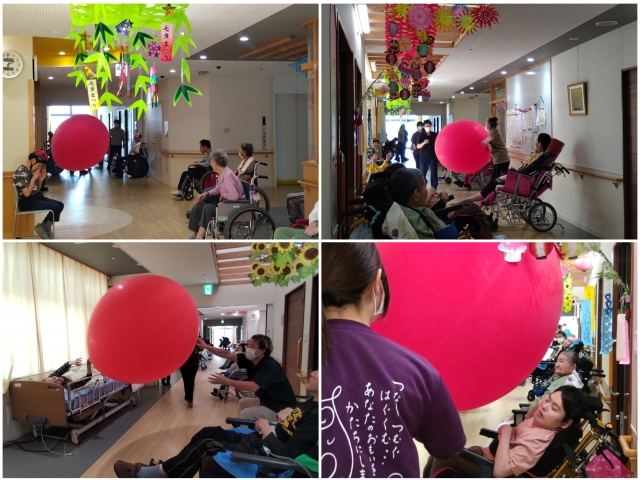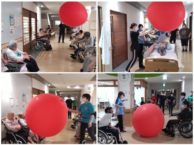 各フロア中央廊下を利用者・職員が協力しあって大玉を運んでいきました。