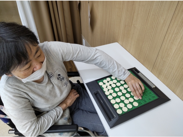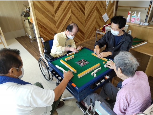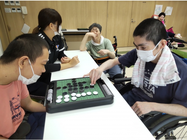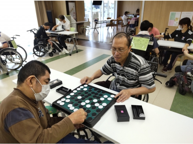 日中活動【オセロ】がありました。 今回のオセロは民生委員さんが少なかったので、利用者同士や職員とゲームを楽しみました。 対戦しない利用者は、コマ並べをしたり指先の訓練をしたりしていました。 カフェ室の方では麻雀希望の利用者が…。 人数が一人足りなかったので、急遽所長が参戦してくれました。
