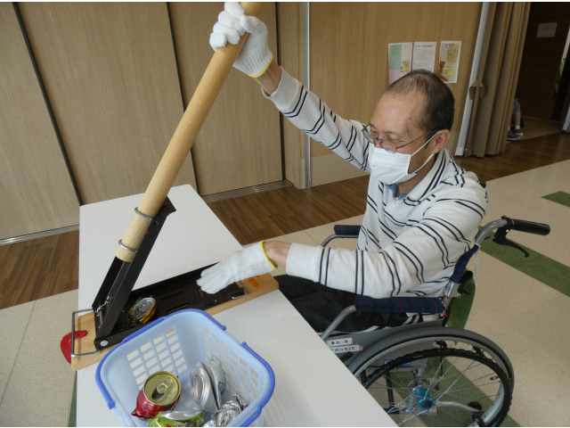 今回は空き缶作業の様子です。🥫はなのきでは、潰した空き缶を近隣の小学校へお渡しし、資源回収に協力させていただいています。空き缶潰しの器具を使用して、数センチの厚さにまで薄くします。みなさん力強く器具の取っ手を引いてどんどん潰していきます!すぐに空き缶のおかわりの声が聞こえてきて、大盛況です!