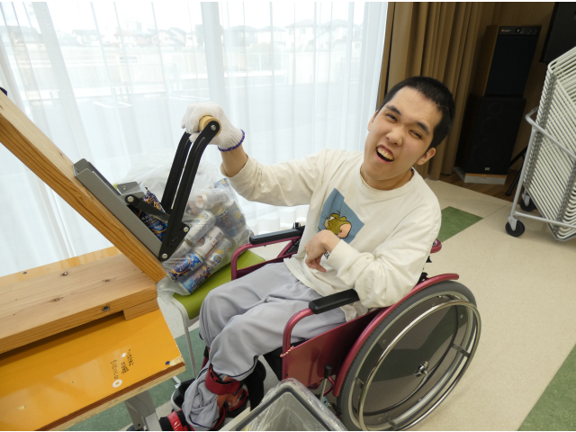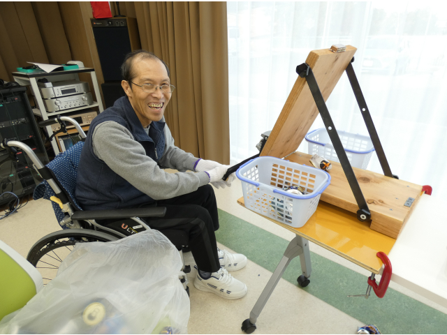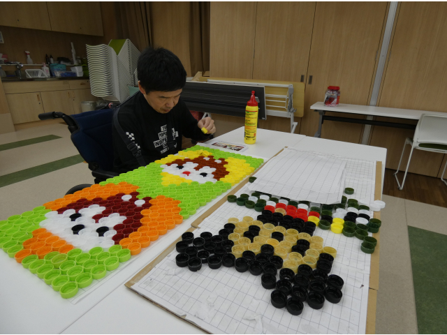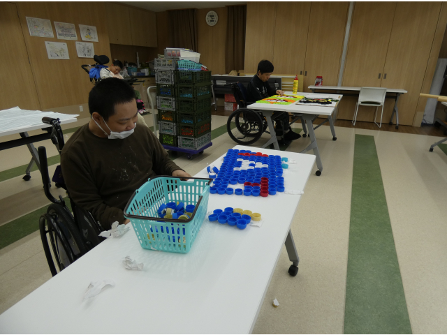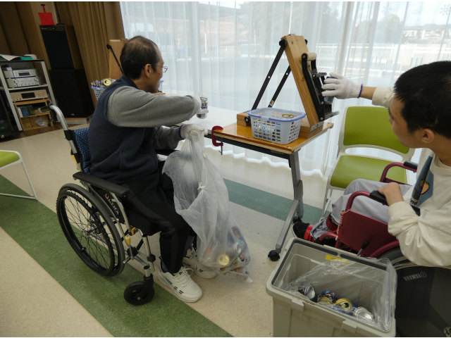 空き缶を潰す作業を行いました🥫作業が得意なお2人が黙々と進めます。先に作業を終えたからと、自ら相手の分をお手伝いされていました☺️思いやり合いながら協力されていて、ほっこりしました。 一方では、キャップアートの生まれ変わりの準備が進められています。役目を終えた作品の解体、作成中の作品のキャップの固定と役割分担して頑張ります!💪🏻