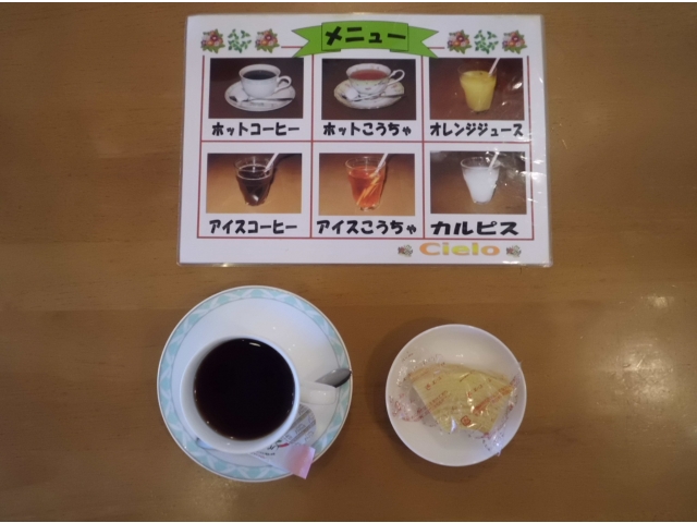 - 喫茶 メニュー表と美味しいコーヒーとバウムクーヘン
