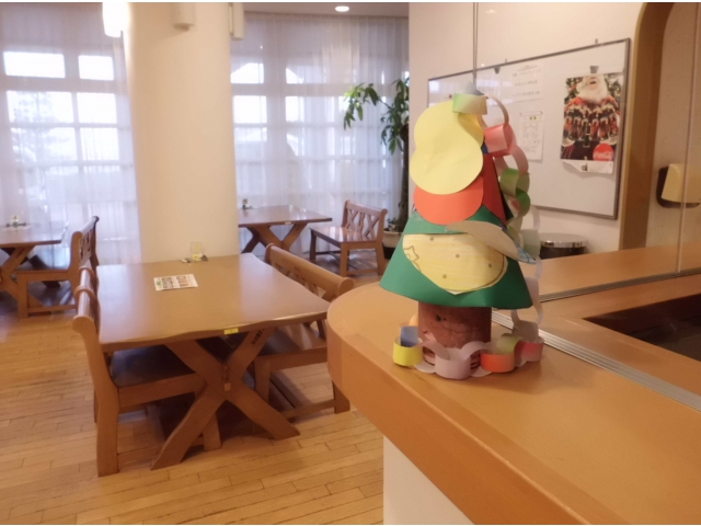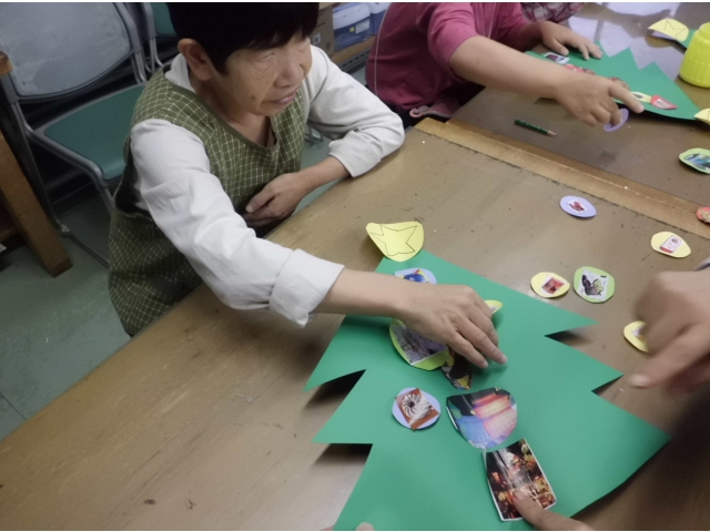 モミの木の台紙を用意し、画用紙を丸く切りぬいたものを沢山作り、そこに広告などから皆さんが好きなグッズ(お花や食べ物などなど)を切り抜いたものを思い思いにモミの木へ貼ってX'masツリーを作りました。その間、「可愛い!」、「わーいっ!」等利用者様からの歓声が嬉しく沢山響き渡りました。