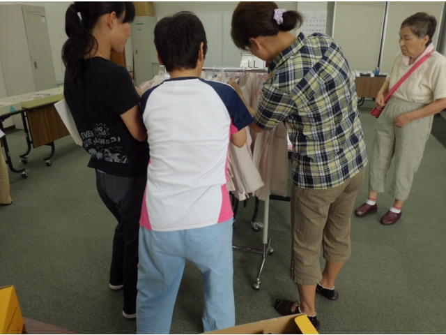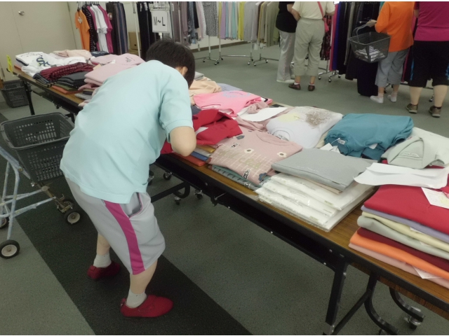 会場では衣類の種類も多く、利用者の皆様は衣類選びに夢中になり、服の色や柄を見て好きな衣類を探されていました。また、近くにいる職員に声を掛けて自分に似合っているか聞いている利用者様もいました。