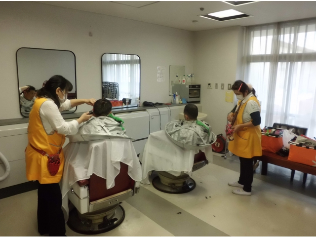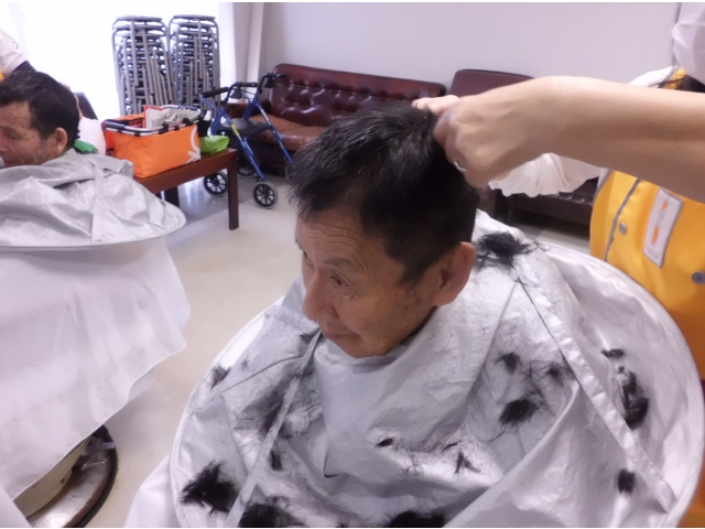 毎月、施設内美容で、「B-1リンデン」の方々が来所し、利用者の散髪をしてくださっています。