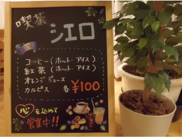 愛厚 半田の里 就労継続支援B型事業で行っています、喫茶店「シエロ」は、なんとメニューが全て100円! 飲み物にお菓子が付いて100円!
