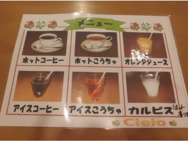 定番メニュー(ホットコーヒー、アイスコーヒー、ホット紅茶、アイス紅茶、オレンジジュース、カルピス)のほかに、無農薬で栽培した季節のフルーツで作った果汁100%フレッシュジュースが期間限定であります。
