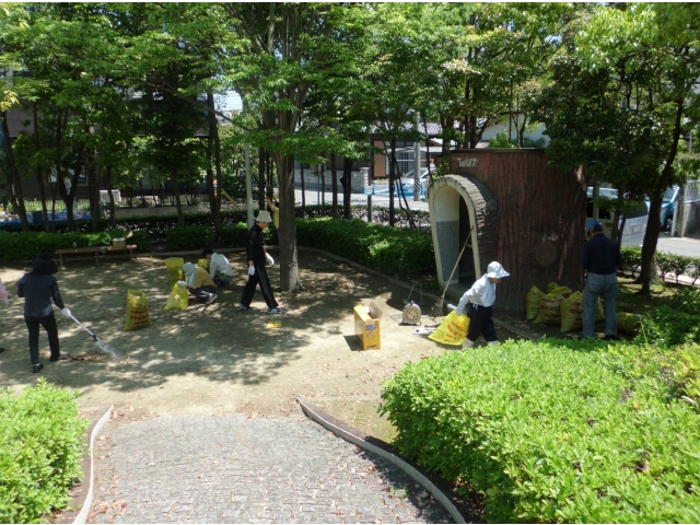 平成28年5月18日(水)に地域ボランティア活動として愛厚半田の里の近くにある稲荷公園の清掃活動を行いました。鴉根区長様を始め地域住民の皆様と一緒に利用者様8名が落ち葉集めなどの清掃活動を行なうことができました。
