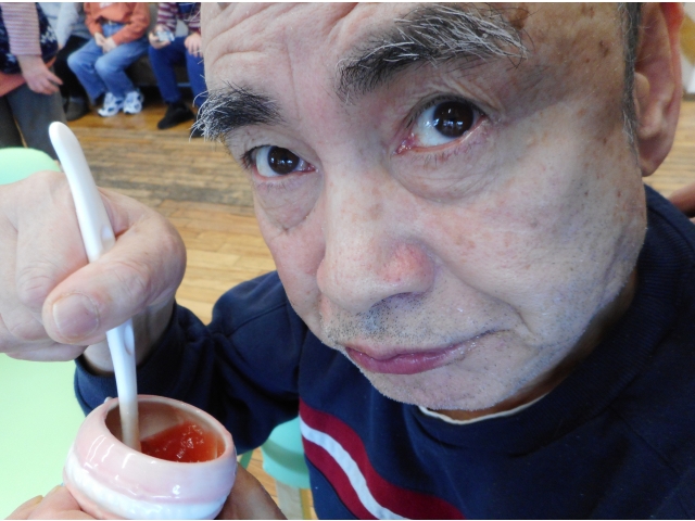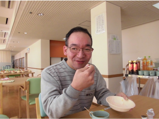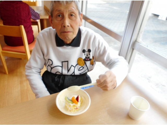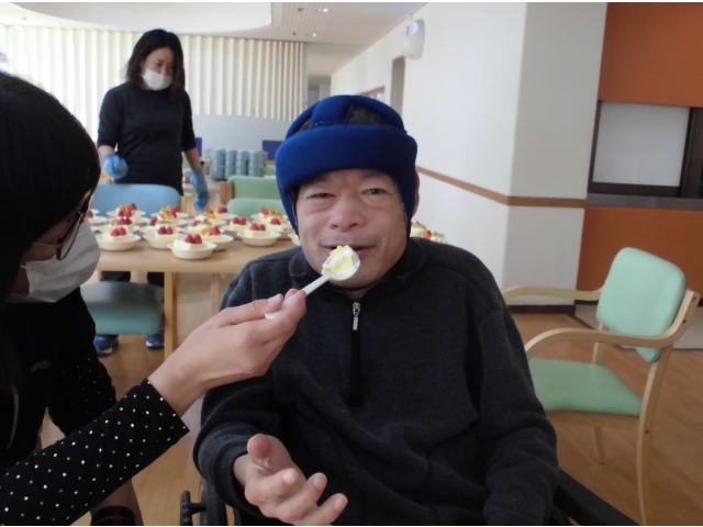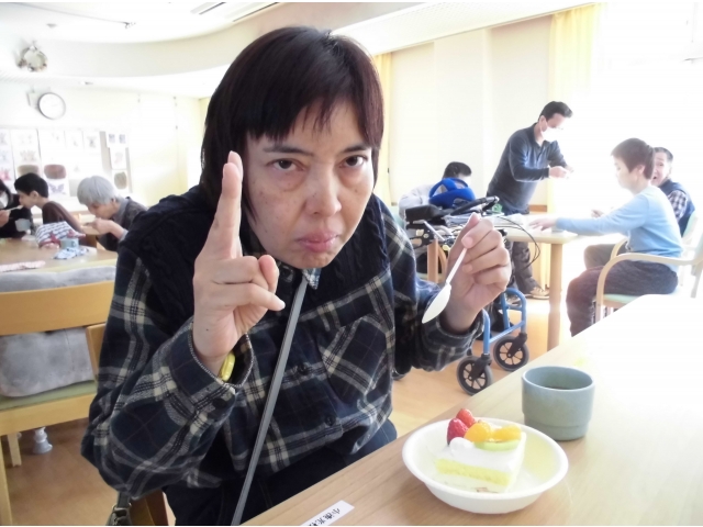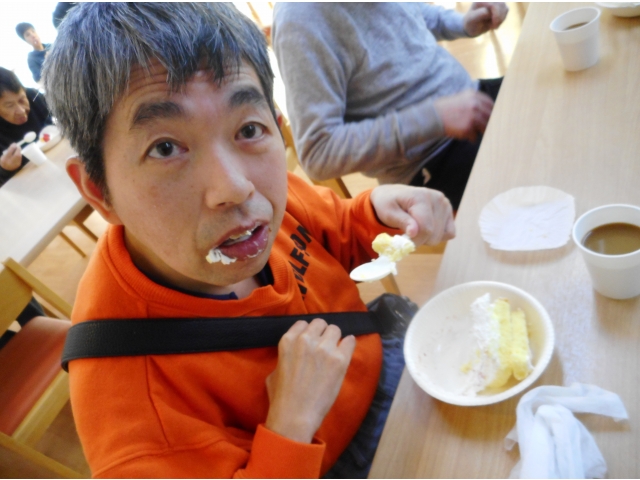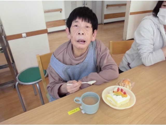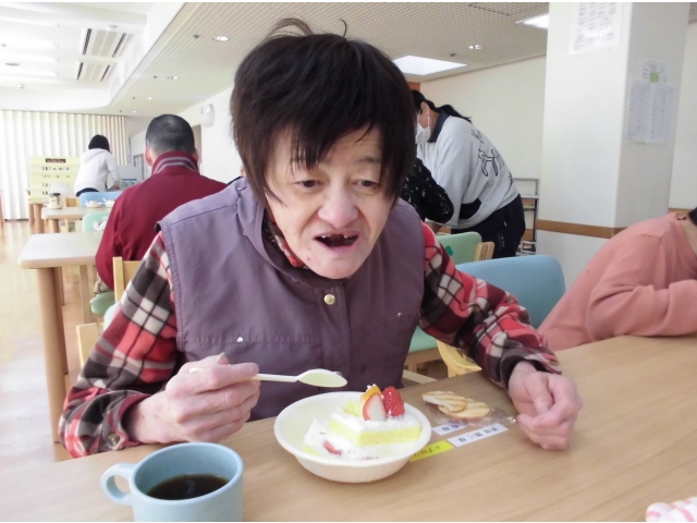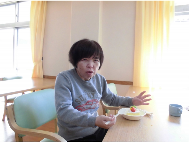 昨年に引き続き、今年も歳末分配金で利用者皆さんケーキをいただきました。大好きなケーキを食べると、皆さんの笑顔が溢れていました。