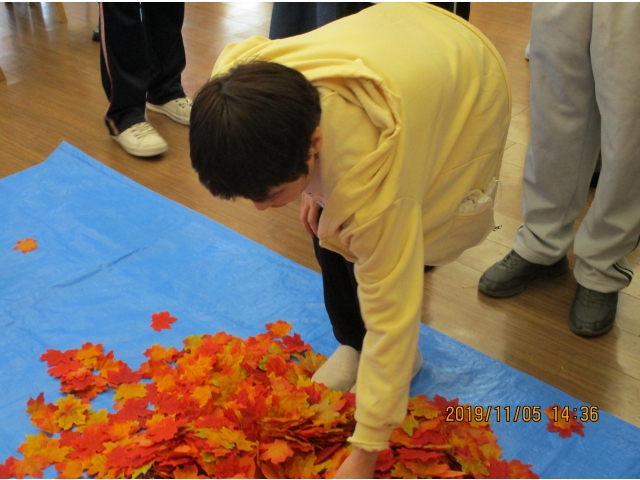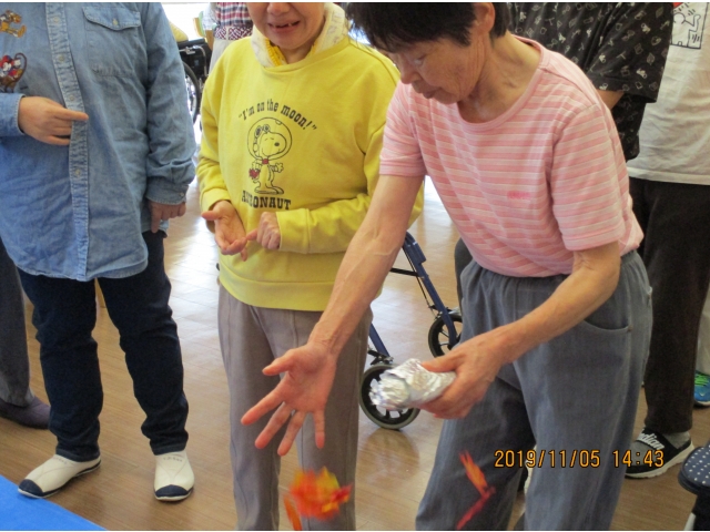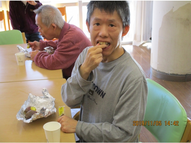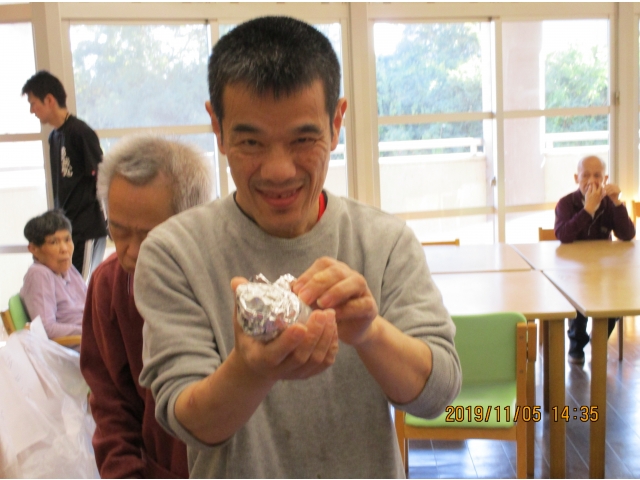 11月5日に焼き芋会を行いました。ブルーシートに焼き芋を置き、その上から落ち葉をかけて皆さんに探してもらいました。皆さん自分で見つけると喜びも大きく、ジュースと一緒に美味しそうに焼き芋を食べていました。(゚~゚)また来年も行なっていきたいですね。
