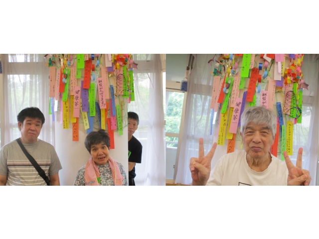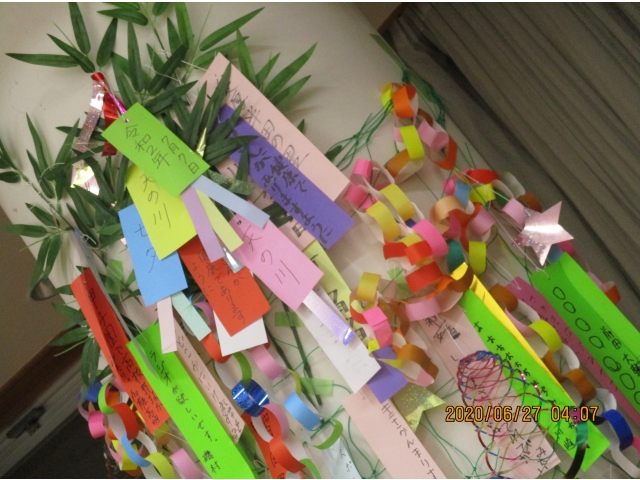 7月7日の七夕に向けて、願い事を皆さんに書いてもらいました。笹に飾ってプレイルームの柱に立てると皆さん嬉しそうに眺めていました。利用者様、職員の願い事が叶いますように・・・( ー人ー)