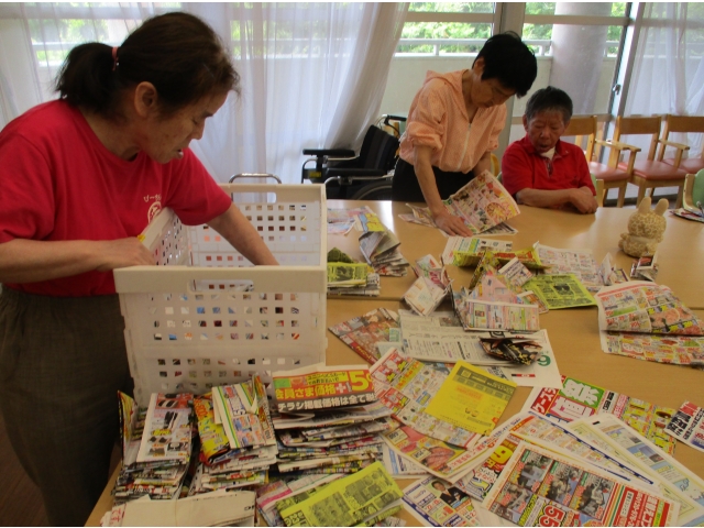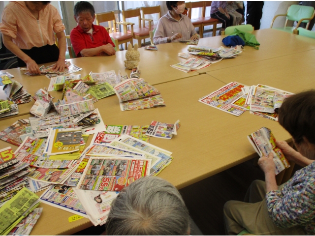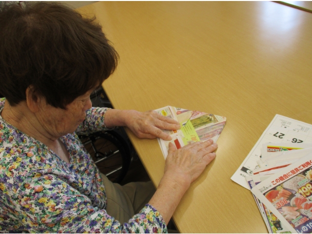 半田の里では食事の際に出たゴミや、使用済みのスティックコーヒーの袋を入れる箱を利用者様に折ってもらっています。