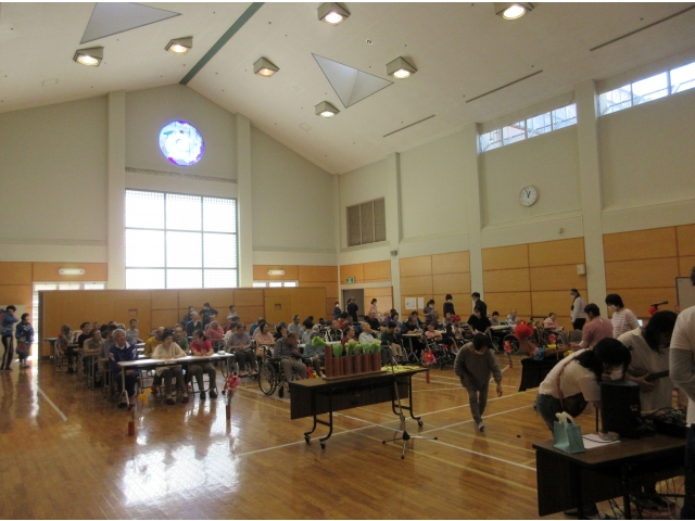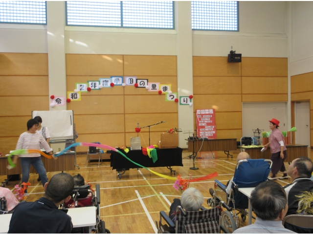 今年はコロナ感染症の影響で、利用者様、職員、ステージ・模擬店のボランティア様のみの参加という、規模を縮小した形で実施しました。当日は心配していた台風も去り、秋晴れの中、午後からまつりが開催されました。まずはおいしいお弁当をいただき、模擬店では、綿菓子、お菓子つかみ、輪投げ、ヨーヨー釣り、朝市・喫茶がありました。またステージでは、劇団わすれんぼ様の腹話術&手品、ハロレレ様のウクレレ、クラウンむーちょのマジックショーとバラエティー豊かな内容でした。そして…最後は、音楽クラブの合唱でステージを締めくくりました。今年はコロナウイルスのため、外出や面会、レクリエーション等の機会が減ってしまいましたが、利用者の皆さんに、リフレッシュしていただき、楽しいひと時を過ごしていただけたと思います。