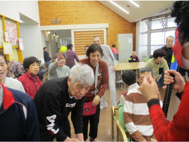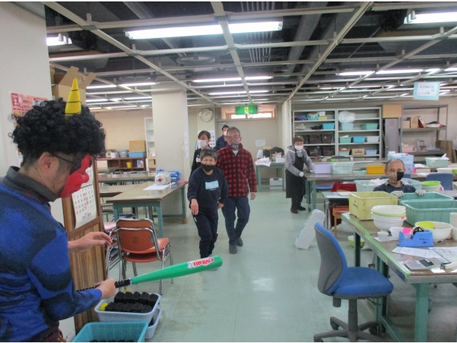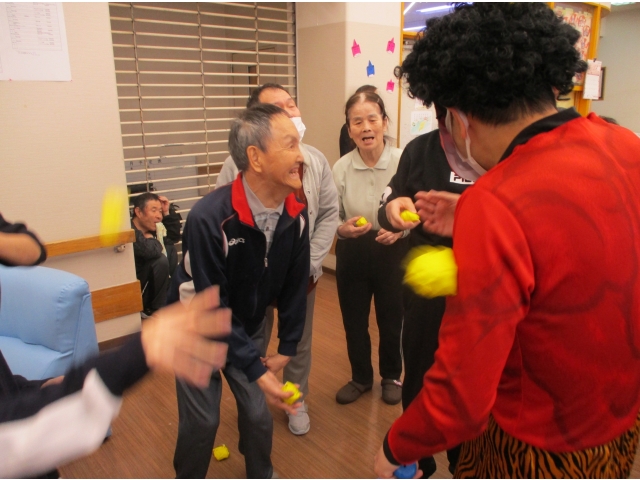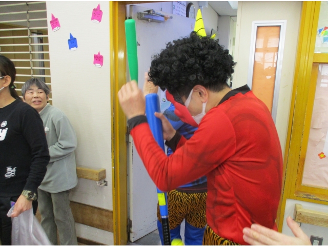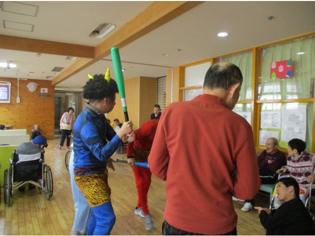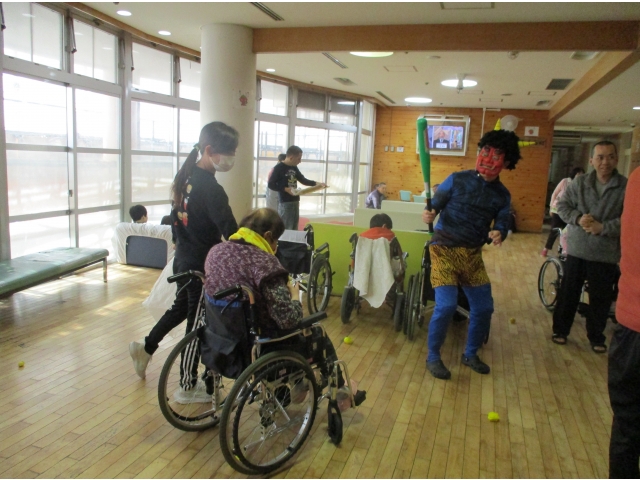 豆の代わりに新聞紙で作ったボールを鬼に投げて、当たると盛り上がりました。