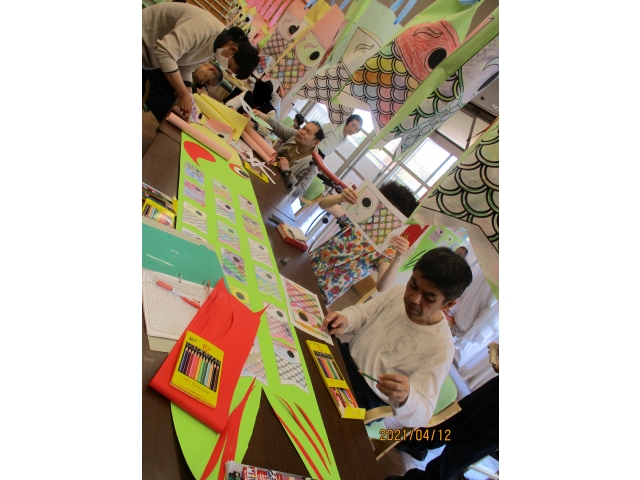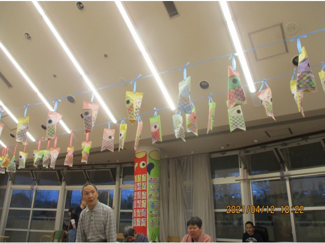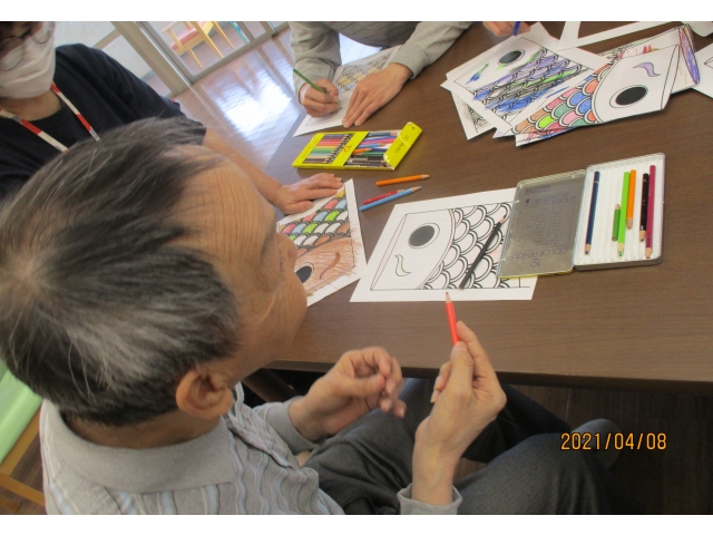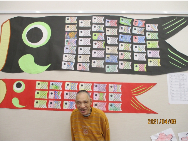 半田の里では日課の創作クラブで様々な物を利用者様に作ってもらっています。今回は5月に向けてこいのぼりを皆さんに塗り絵で塗ってもらい、大きな鯉に張り付けて飾りました。(゚∀゚*)自分の塗った鯉を楽しそうに探している人の姿も…